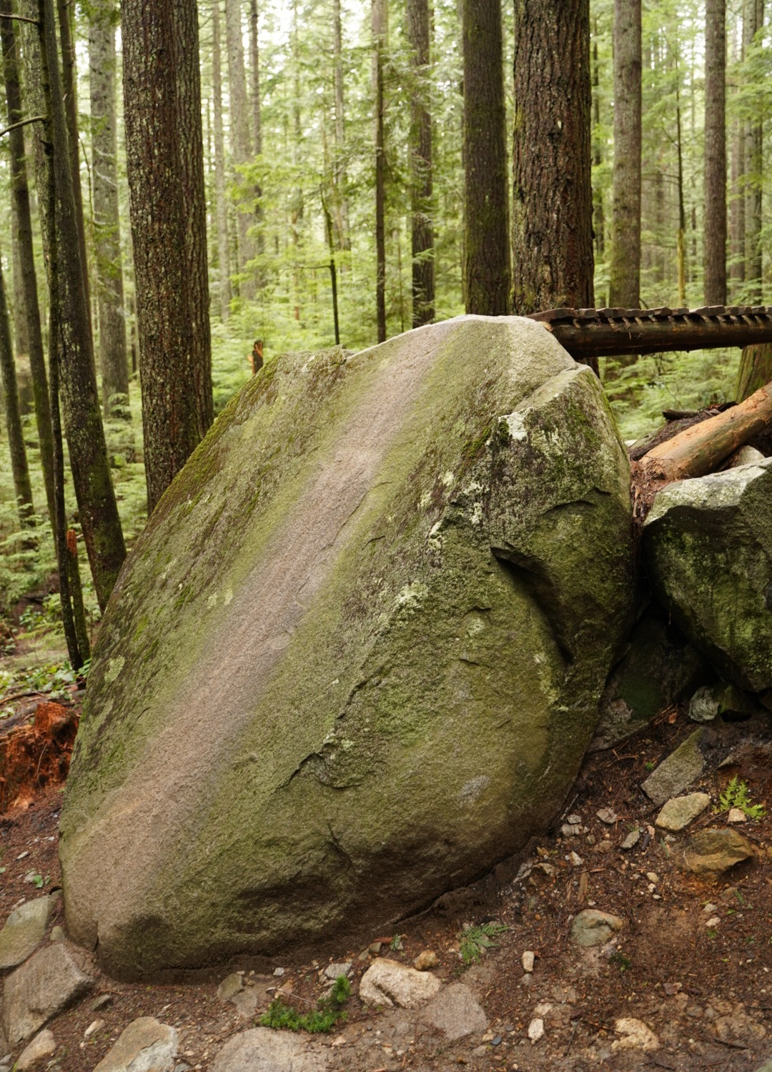 About a third of the way down you will encounter the impossible to miss granite slab known as The Big Smooth. This rock feature has made it’s way around the Mountain Biking world and continues to be one of the most recognizable features here on the North Shore.